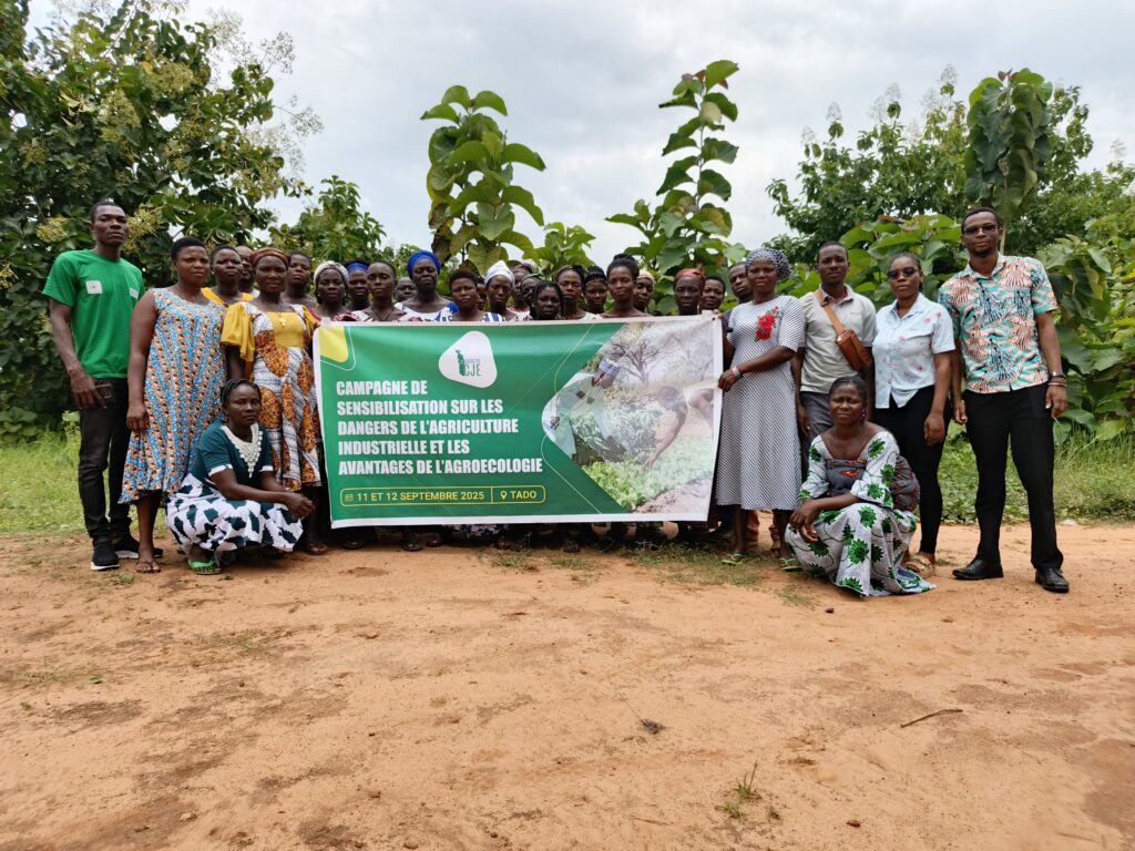Du 11 au 12 septembre 2025, le Centre pour la Justice Environnementale Togo (CJE-Togo) a organisé à Tado, une localité du sud-est du pays située à la frontière du Bénin, une campagne de sensibilisation et de conscientisation sur les dangers de l’agriculture industrielle et les avantages de l’agroécologie. Cette initiative s’inscrit dans la mission du CJE-Togo qui œuvre pour une justice sociale et environnementale à travers la promotion des bonnes pratiques agricoles en harmonie avec la nature, qui ne sont d’autres que les pratiques agroécologique une illustration forte de la souveraineté alimentaire.